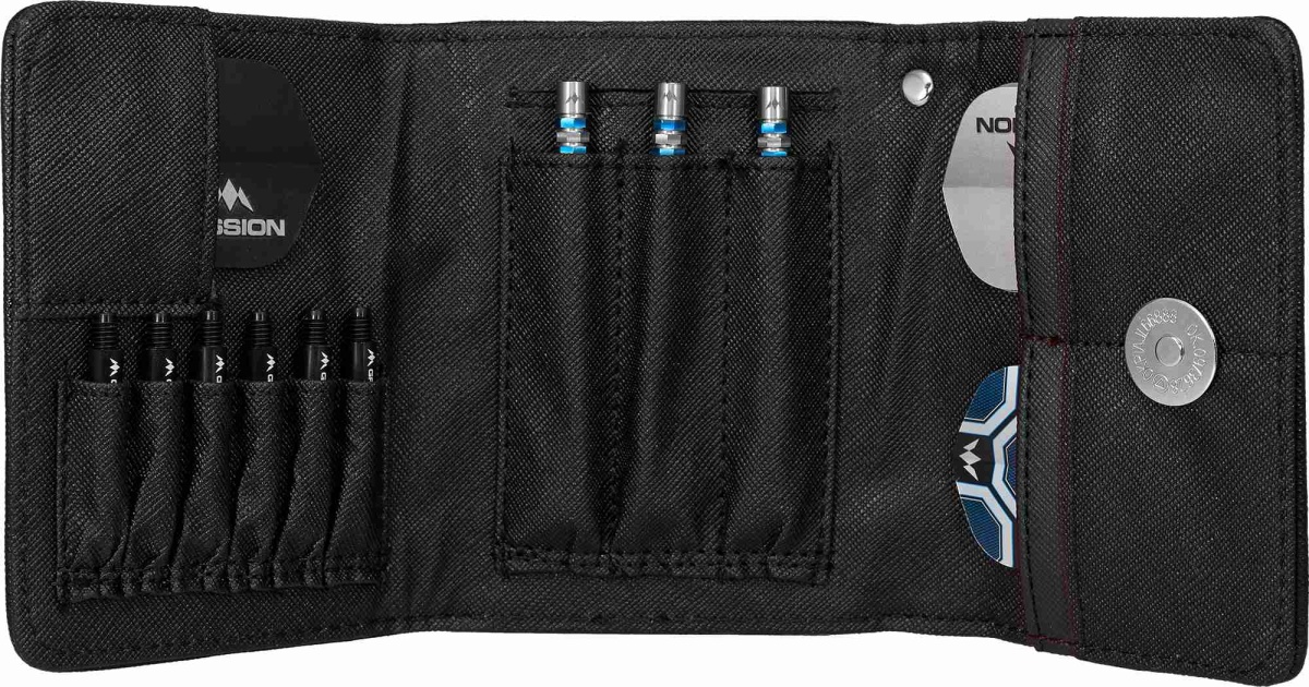 Pouzdro na šipky Mission Flint je perfektním úložným prostorem pro vaše šipky. Struktura umělé kůže je odolná a vypadá skvěle. Je zvýrazněna designem Flint a logem Mission. Pouzdro vypadá jako peněženka a je určeno pro jednu sadu kompletně sestavených šipek a příslušenství. Pouzdro má zadní kapsu na zip, oko z nerezové oceli a bezpečné magnetické zavírání.