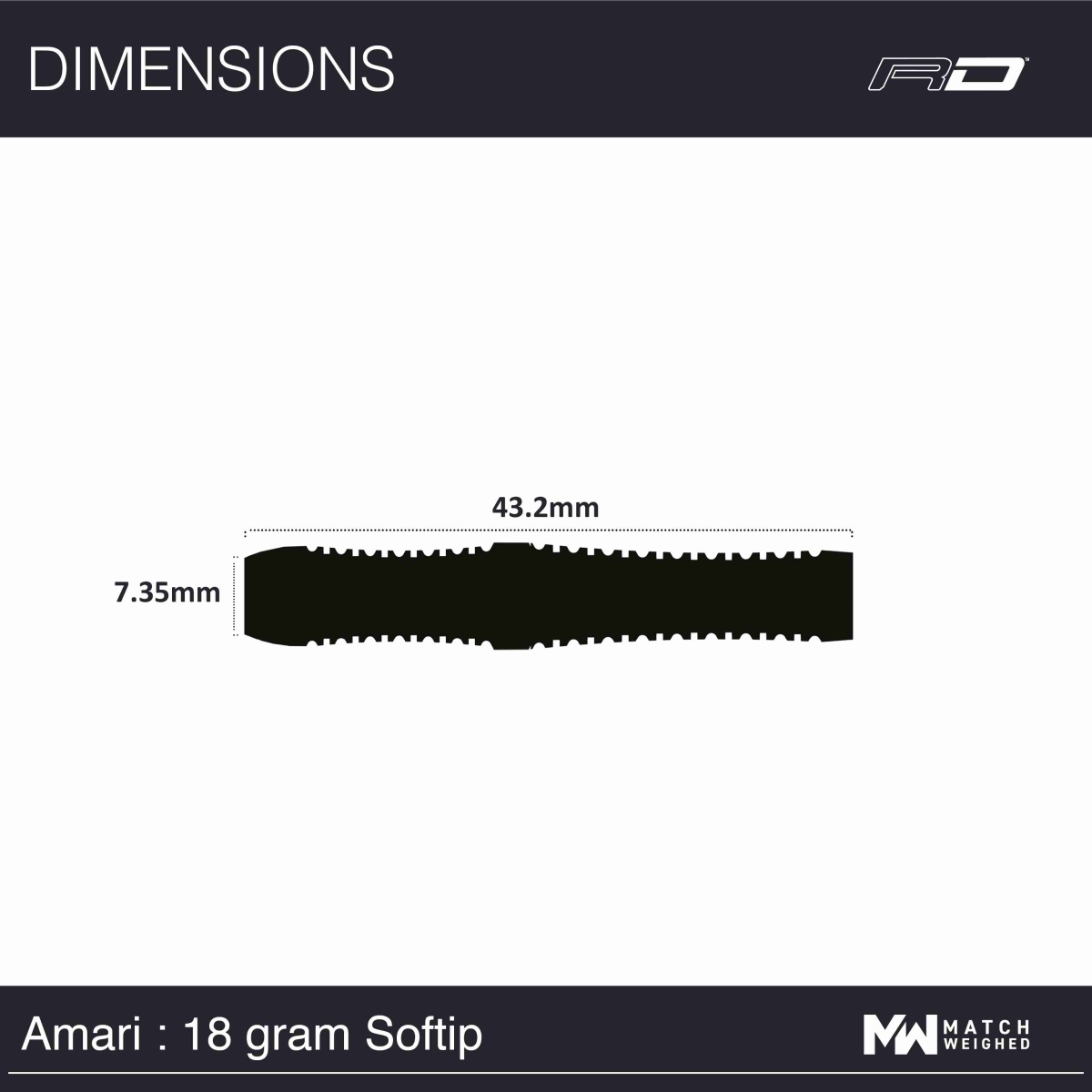Softové šipky Red Dragon Amari jsou wolframové šipky (90% tungsten) s barrely, které jsou po celé délce vroubkované a zdobí je logo RD. Barrely jsou doplněny nylonovými násadkami Nitrotech a letkami Red Dragon.