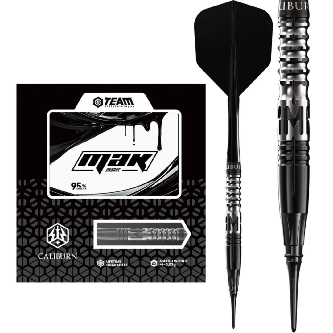Softové šipky Caliburn Player - Mak jsou wolframové šipky (95% tungsten) v úchvatném designu. Barrely mají unikátní drážkování.
