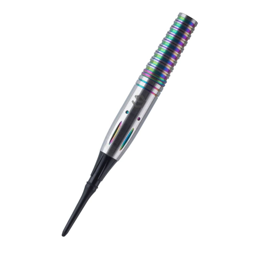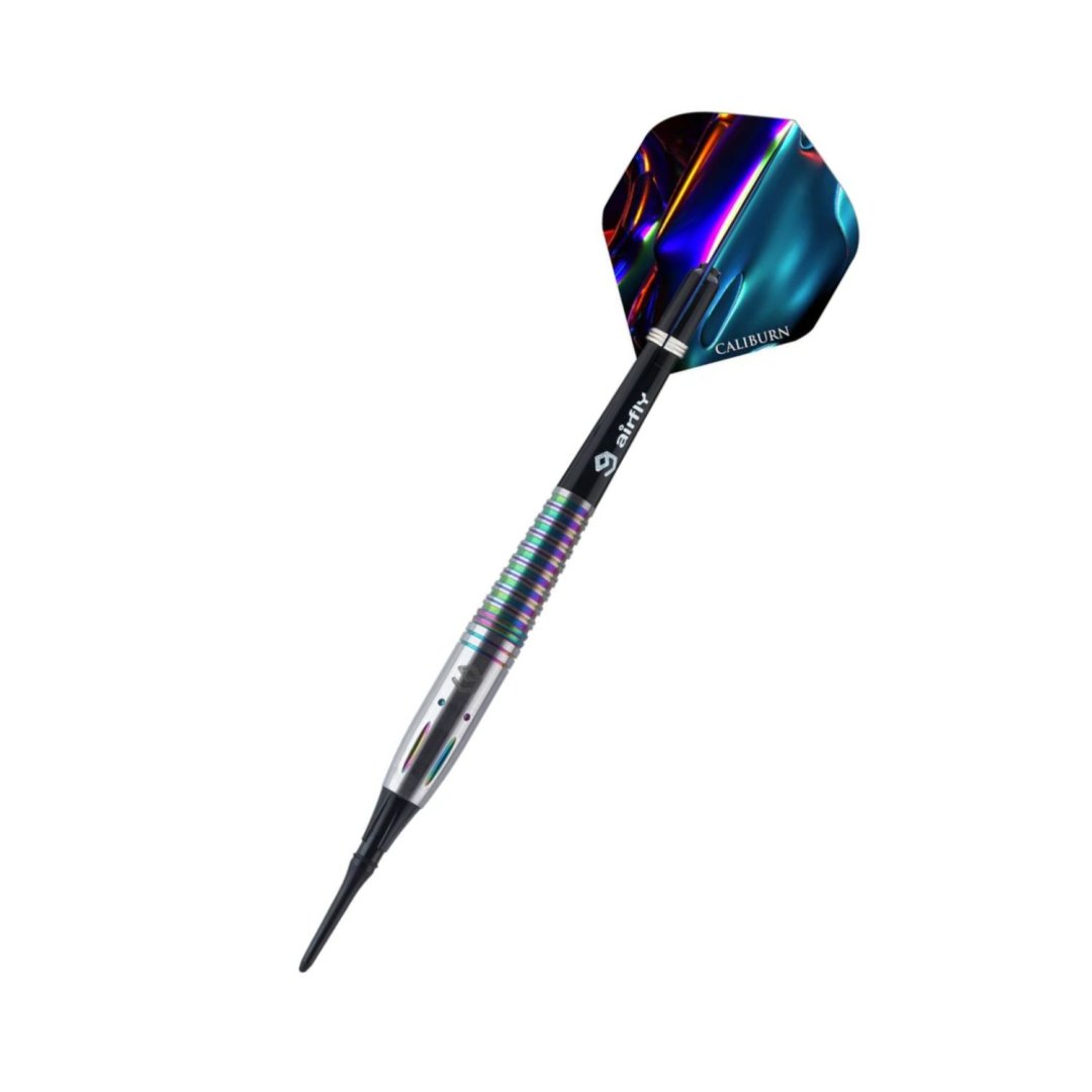 Softové šipky Caliburn Element jsou wolframové šipky (90% tungsten) v úchvatném designu. Barrely mají drážkování zvýrazněné duhovými barvami.