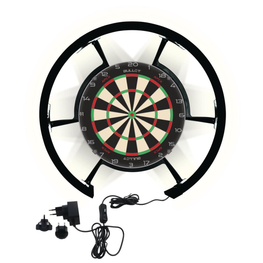 Bullet Radion 300 je osvětlení sisalového terče, které vám zajistí skvělé osvětlení bez stínů. Tento modulární LED prstenec je vyroben z odolného ABS plastu, má čistý, profesionální vzhled a snadno se instaluje. Má 5 sekcí, 28 vysoce intenzivních LED diod v každé sekci a poskytuje tak celkový výkon 1000 lumenů, což zajišťuje jasné a rovnoměrné osvětlení bez stínů. Systém obsahuje 3 magnetické nožičky, z nichž každá je vybavena dvojitými magnety pro bezpečné uchycení a 2 koncové krytky pro dokonalý vzhled. 3-metrový kabel umožňuje flexibilní umístění, zatímco přiložený univerzální adaptér podporuje zástrčky EU, USA a Velké Británie, což je ideální pro hráče po celém světě. Sada obsahuje také 6 konektorů pro snadnou montáž. Bullet Radion 300 Light je idální volbou pro šipkové nadšence, kteří ocení výkon, jednoduchost a styl.