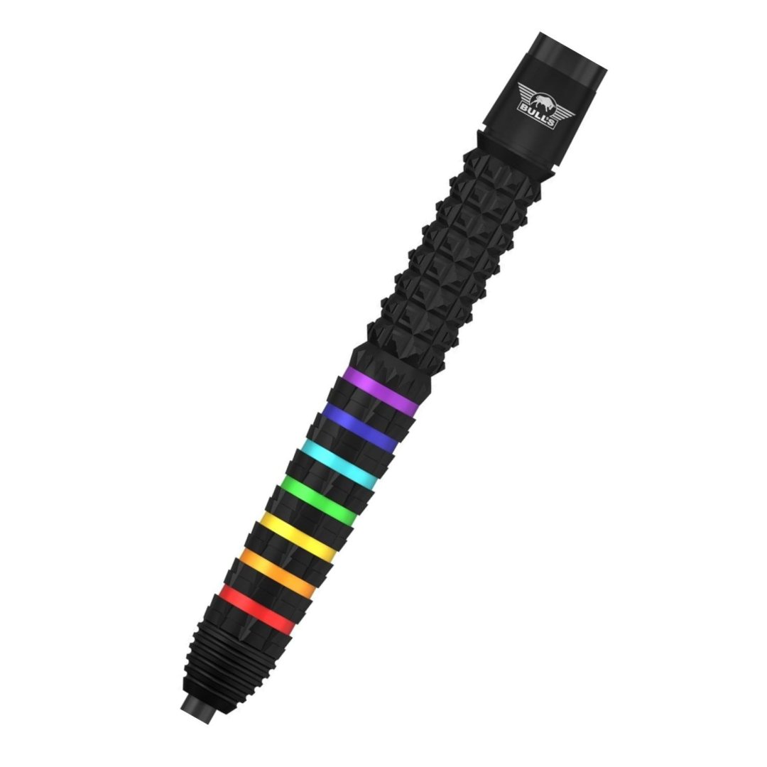 Steelové šipky Ricky Evans jsou wolframové šipky (95% tungsten) s černými barrely s barevnými proužky.