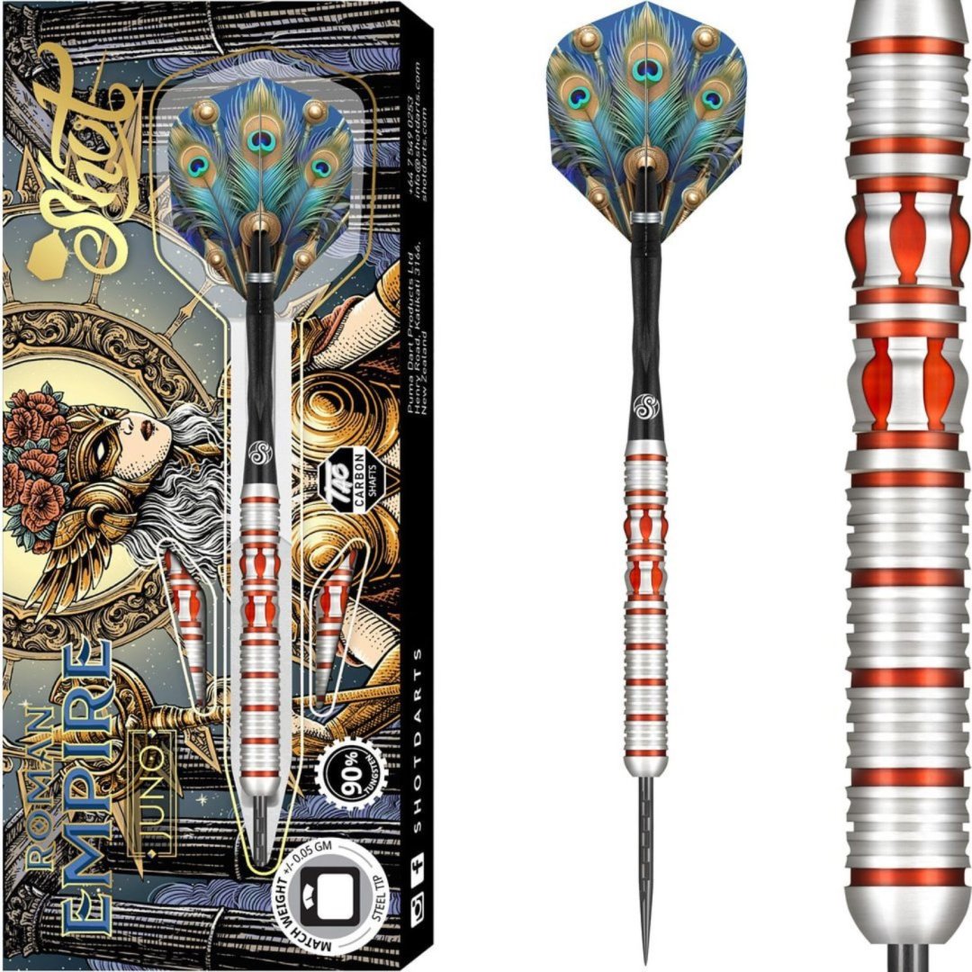 Steelové šipky Shot Roman Empire Juno jsou wolframové šipky (90% tungsten) s barrely s červenými drážkami v jedinečném designu. Barrely jsou doplněny nylonovými násadkami a letkami Shot.