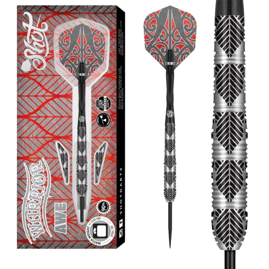 Steelové šipky Shot Warrior Awe jsou wolframové šipky (90% tungsten) s originálními a naprosto ohromujícími barrely. Barrely jsou doplněny nylonovými násadkami a letkami Shot.