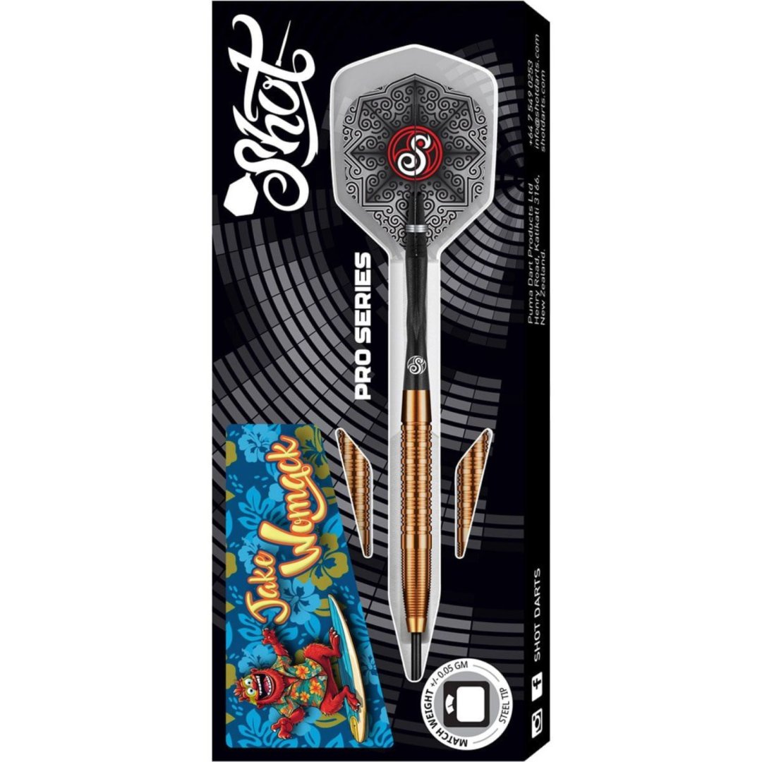 Steelové šipky Shot Jake Womack jsou wolframové šipky (90% tungsten) s bronzovými barrely. Barrely jsou doplněny nylonovými násadkami a letkami Shot.